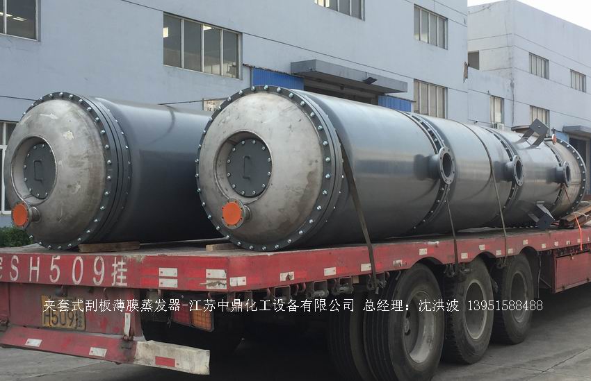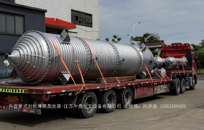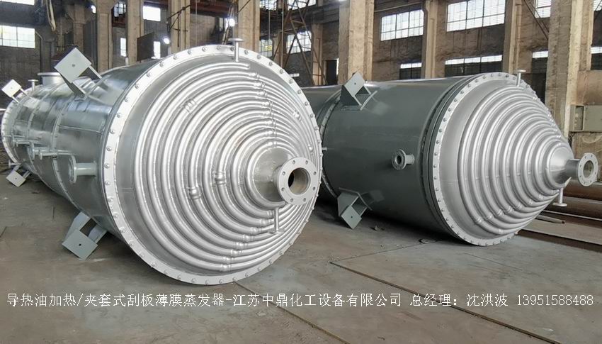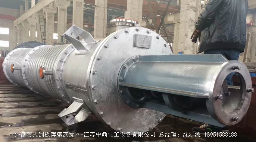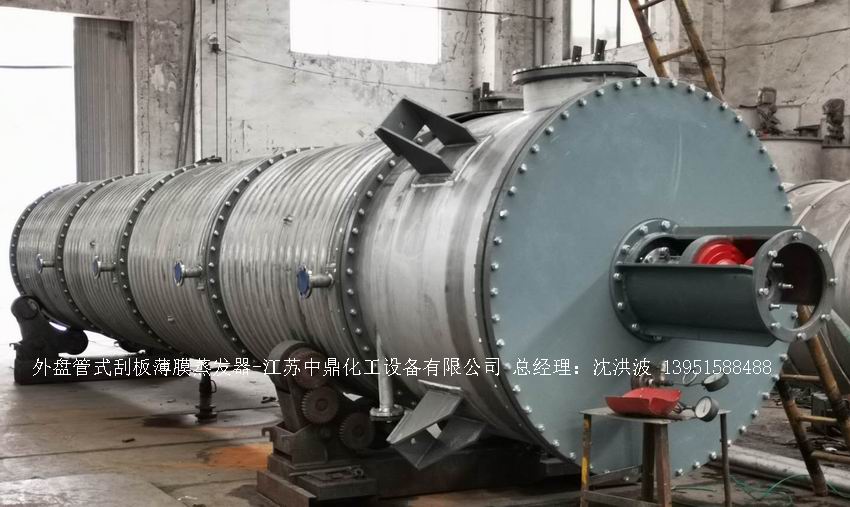 江蘇中鼎化工設(shè)備有限公司--離心式刮板薄膜蒸發(fā)器主要由加熱外盤半管式夾套(半管夾套內(nèi)走蒸汽,導(dǎo)熱油,熔鹽或者熱水等循環(huán)給蒸發(fā)器外壁加溫,通過熱傳導(dǎo),把蒸發(fā)器內(nèi)壁形成的物料薄膜中的水份蒸發(fā)減少,提高物料的濃度百分比。一般設(shè)計壓力為0.3mpa~2.5mpa左右,如果是蒸汽溫度一般在180°以下,導(dǎo)熱油溫度一般在280°以下,熔鹽溫度一般在380°以下。刮板也稱刮刀(刮板分為:玻纖四氟刮板、碳纖維四氟刮板、石墨四氟刮板、黃銅刮板、合金鋼等)和傳動裝置:電機(普通變頻電機、防爆變頻電機、高速變頻電機),減速機(擺線針輪減速機、齒輪減速機),機架,軸封系統(tǒng)(單端面機械密封、雙端面機械密封、磁力密封等,如果抽真空必須選用雙端面機械密封或者磁力密封),轉(zhuǎn)動軸、汽液分離裝置、液體分布器蒸發(fā)器轉(zhuǎn)子支架、軌道刮板槽、底部軸套等部件組成。外盤半管內(nèi)或者夾套內(nèi)通加熱的熱源,刮板裝在可旋轉(zhuǎn)的軸上,刮板和加熱夾套內(nèi)壁保持很小間隙,通常為0.5~1.5 mm。在旋轉(zhuǎn)時通過離心力,使刮板與內(nèi)壁緊密接觸。把物料從壁上刮下。料液經(jīng)預(yù)熱后由蒸發(fā)器上部進(jìn)料口沿切線方向噴進(jìn),通過液體分布器分散盤把液體均勻分布到蒸發(fā)器筒體表面,在重力和旋轉(zhuǎn)刮板的作用下,均勻分布在蒸發(fā)器內(nèi)壁形成下旋薄膜,并在下降過程中不斷被蒸發(fā)濃縮,完成液由底部排出,二次蒸汽向上從頂部倉逸出(一般通過真空泵抽出)二次蒸汽再通過汽液分離器、冷凝器處理。在某些場合下,這種蒸發(fā)器可將溶液蒸干,在底部直接得到固體產(chǎn)品。這類蒸發(fā)器的缺點是結(jié)構(gòu)復(fù)雜制造\安裝和維修工作量大。